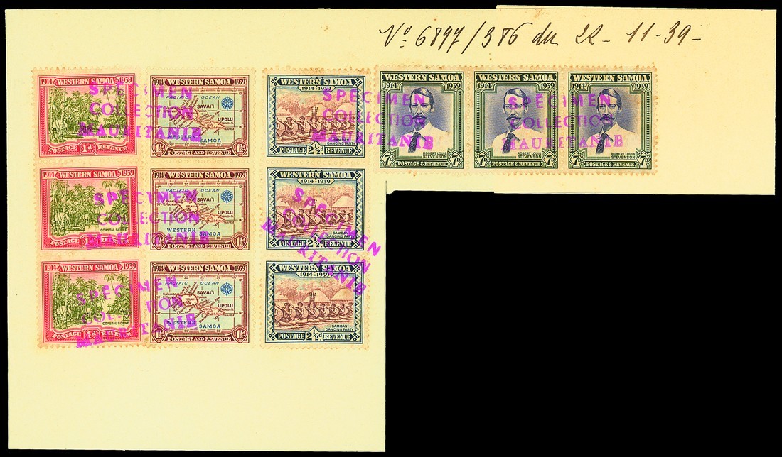 1939 25th. Anniversary of New Zealand Control set of four in strips of three (7d. horizontal), cancelled with several "spécimen/collection/mauritanie" handstamps on archival piece; some light staining though a unique item. Photo