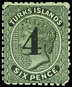 — 4d. Setting 1 "4" Type 28 on 6d, black, fresh unused without gum. Scarce. Signed Holcombe. S.G. 42, £750. Photo