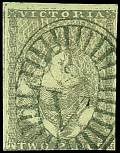 1850-53 Seventh Printing, 2d. deep grey with clear to very large margins on three sides showing portion of adjoining stamp at left, neatly cancelled by Barred Oval "2". S.G. 16a.. Photo