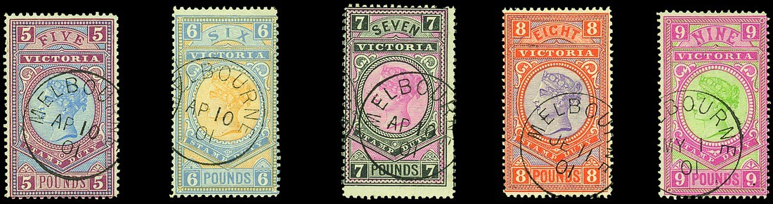 1886-96 £5, £6, £7, £8 and £9 each neatly cancelled-to-order with 1901 c.d.s.; fine and most attractive. S.G. 324-328, £955. Photo