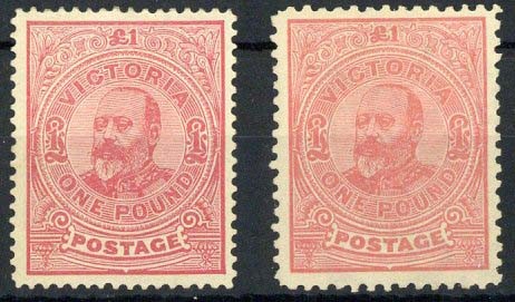 1901-10 perf. 12½ £1 carmine-rose and perf. 11 £1 rose, part and large part original gum respectively. S.G. 399, 407, £675