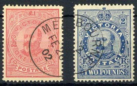 1901-10 perf. 11 £1 rose and £2 deep blue, both neatly cancelled-to-order; sound. S.G. 407, 408