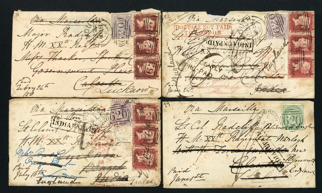 1858 envelopes (9) ex the same correspondence to India, seven with 9d. frankings made by 1855-57 6d. and 1d. (3) though one with 1d. block of eight and single, the others frankeded at 1/- made by 1855-58 6d. (2) or 1/-, all redirected on arrival, five within India, the others back to England, a variety of markings including framed "india unpaid", red framed "postage not paid/to london", etc., mixed condition though an interesting group