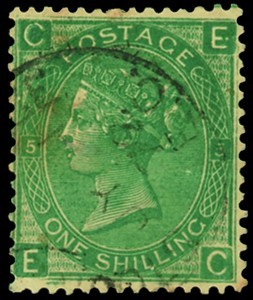 1867-80 1/- green, Plate 5, EC, "Stock Exchange" forgery, used, small stains and creases; fine. R.P.S. Certificate (1984). Photo
