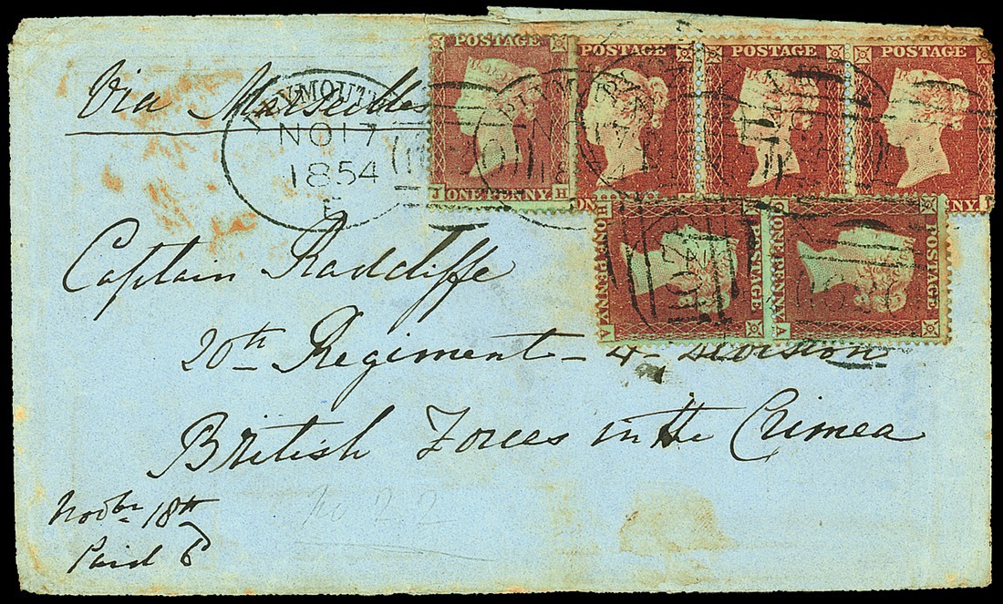 1854 (17 Nov.) envelope Via Marseilles franked watermark small Crown, perf. 16 1d. single, vertical pair, horizontal strip of three (affixed slightly overlapping the edge at right resulting in some damage) , "620" Plymouth Spoon cancellations; slight stains, fine. Photo