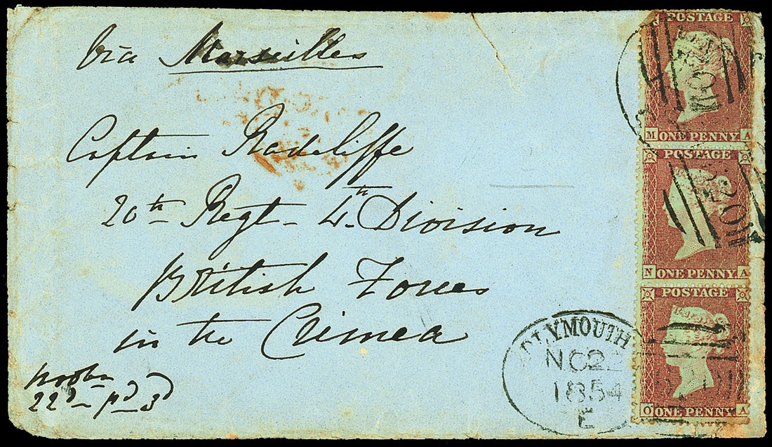 1854 (22 Nov.) envelope Via Marseilles franked watermark small Crown, perf. 16 1d. vertical strip of three with "620" Plymouth Spoon cancellations, slightly creased and stained at lower right; fine. Photo