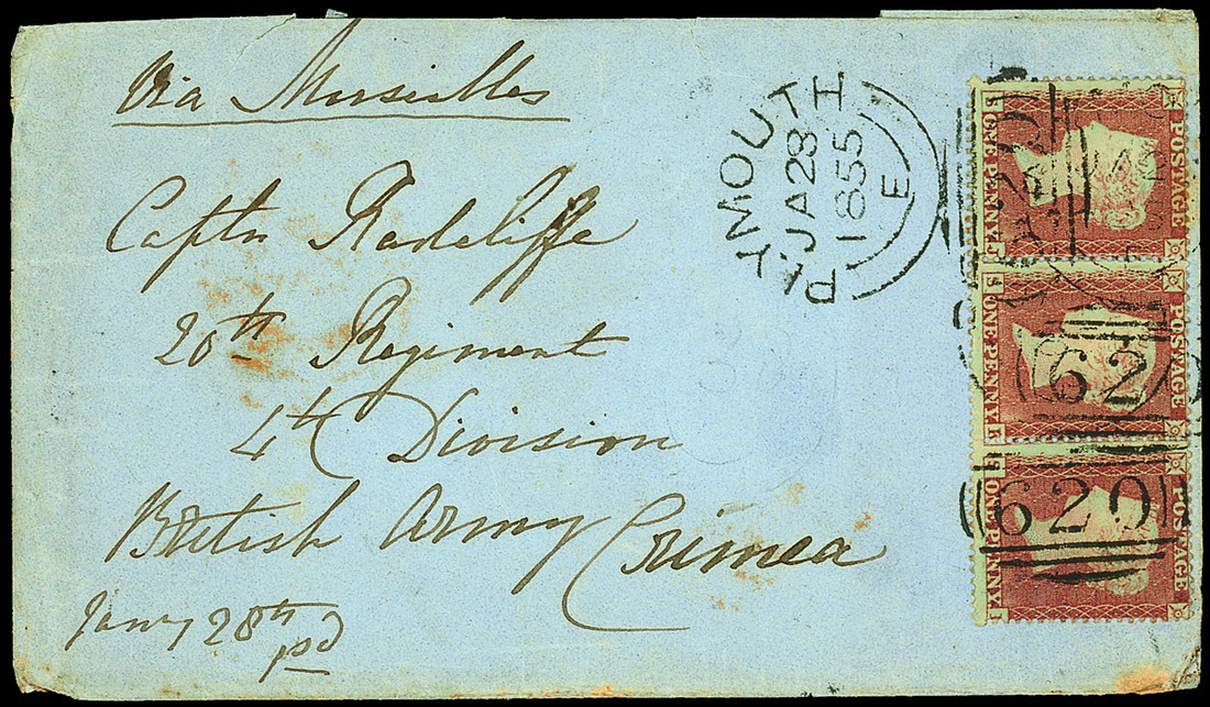 1855 (28 Jan.) envelope Via Marseilles bearing watermark small Crown, perf. 16 1d. strip of three tied by "620" sideways duplex cancellations of Plymouth; small perimeter tear at top and some flap damage; fine. Photo