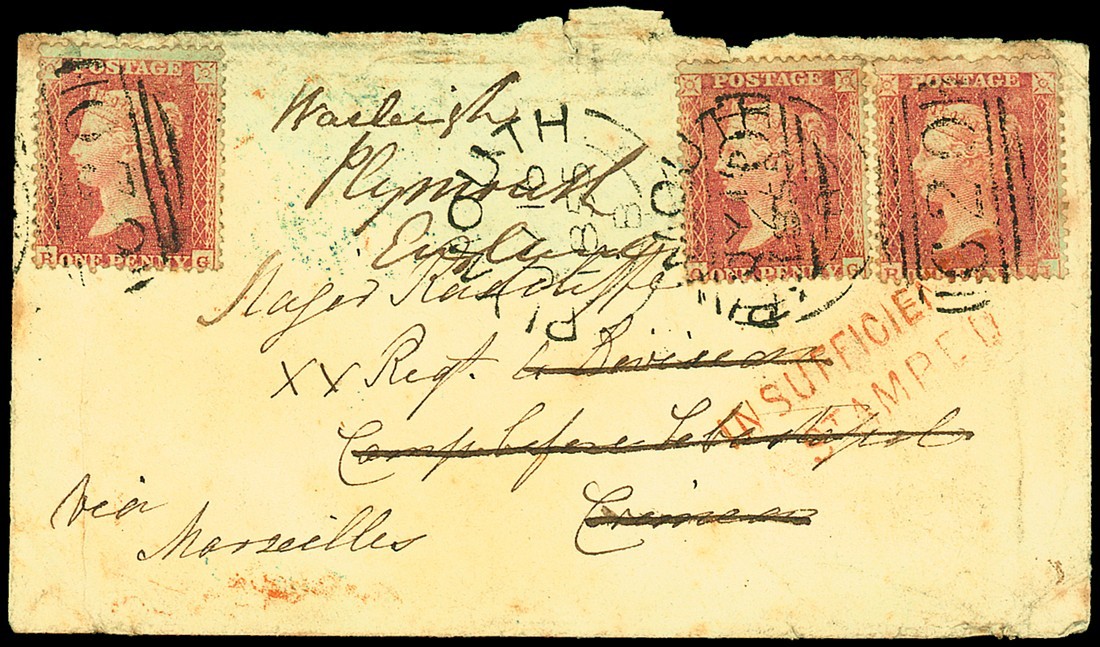 1855 (16 July) envelope franked watermark small Crown, perf. 14 1d. single and pair with "620" sideways duplex cancellations of Plymouth, redirected back to Plymouth and marked "insufficiently/stamped" in red and with blue "post office/british army" datestamp on reverse; flap missing, otherwise fine. Photo