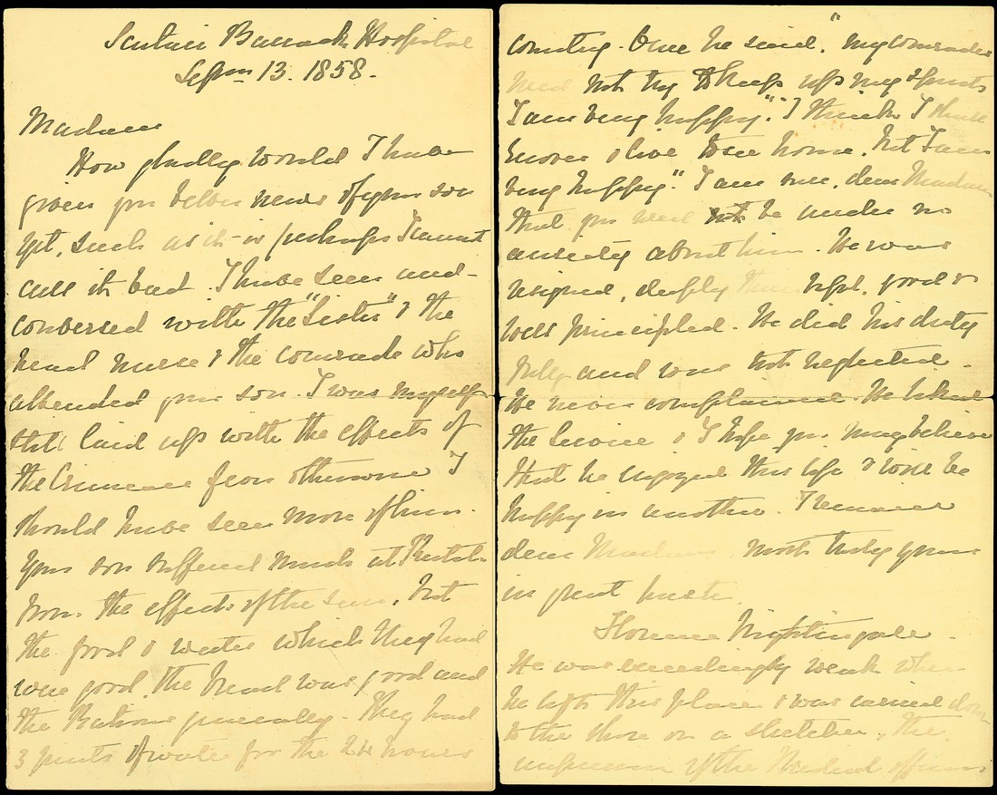 1858 (13 Sept.), a four page letter, headed "Scutari Barrack Hospital", signed Florence Nightingale; folded and some splits along the folds, written in a 'medical' hand but written to the mother of a patient who had died under her care and giving details of her own illness. Rare. Photo