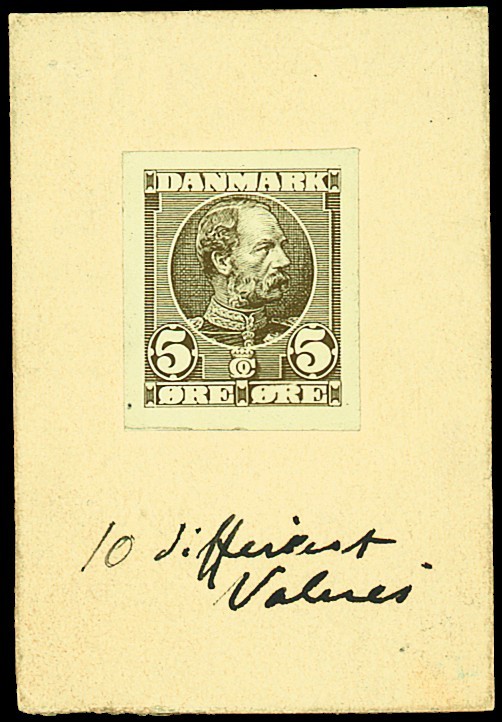 1905-06 King Christian IX, imperforate Bradbury, Wilkinson 5ø photographic essay die proof, in sepia, affixed to card, endorsed 10 different values; fine. Also seven items of unused postal stationery. Photo