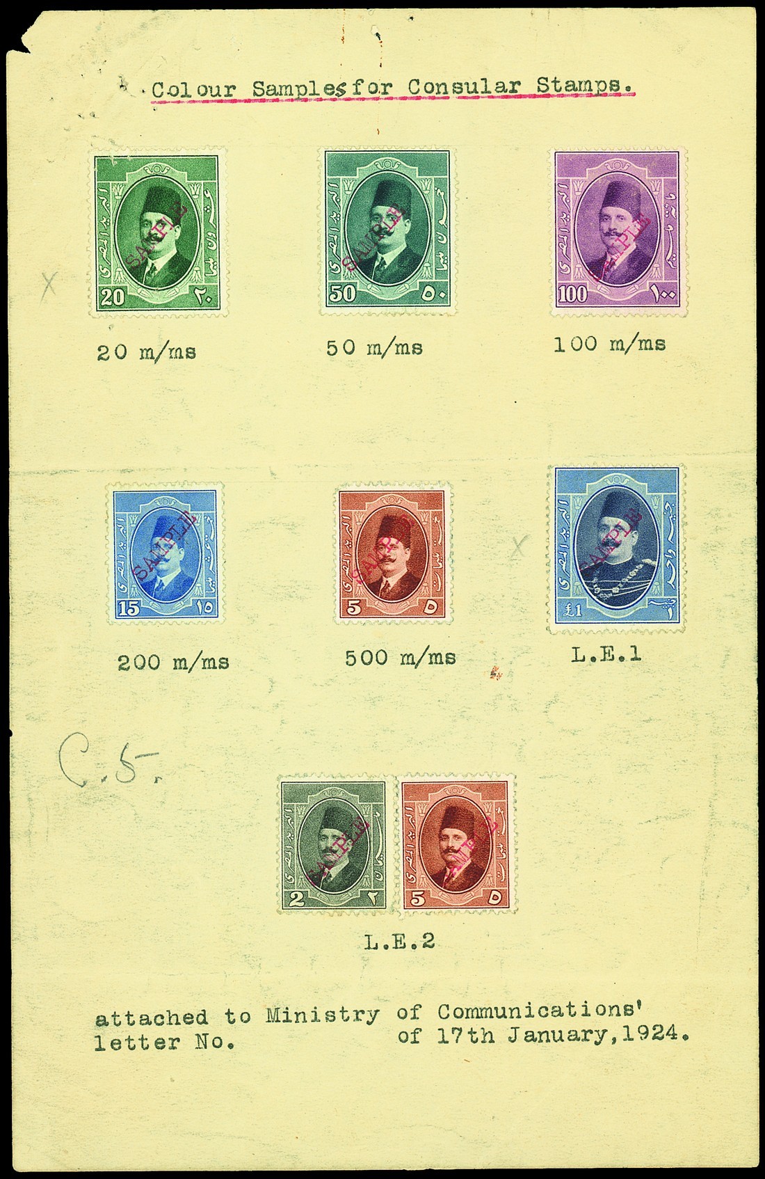 1923-24 2m., 5m. (2), 15m., 20m., 50m., 100m. and £E1, each overprinted "sample" in red and affixed to a sheet of paper with typewritten "Colour Samples for Consular Stamps" with the proposed values from 20m. to £E2 below and "attached to Ministry of Communications' letter No. of 17th January, 1924.". Another sheet with imperforate Die Proofs in black of the frames of the "Service Consulaire" 20m., 50m., 100m., 200m., 500m., £E1 and £E2; some stains and faults. Rare. Photo