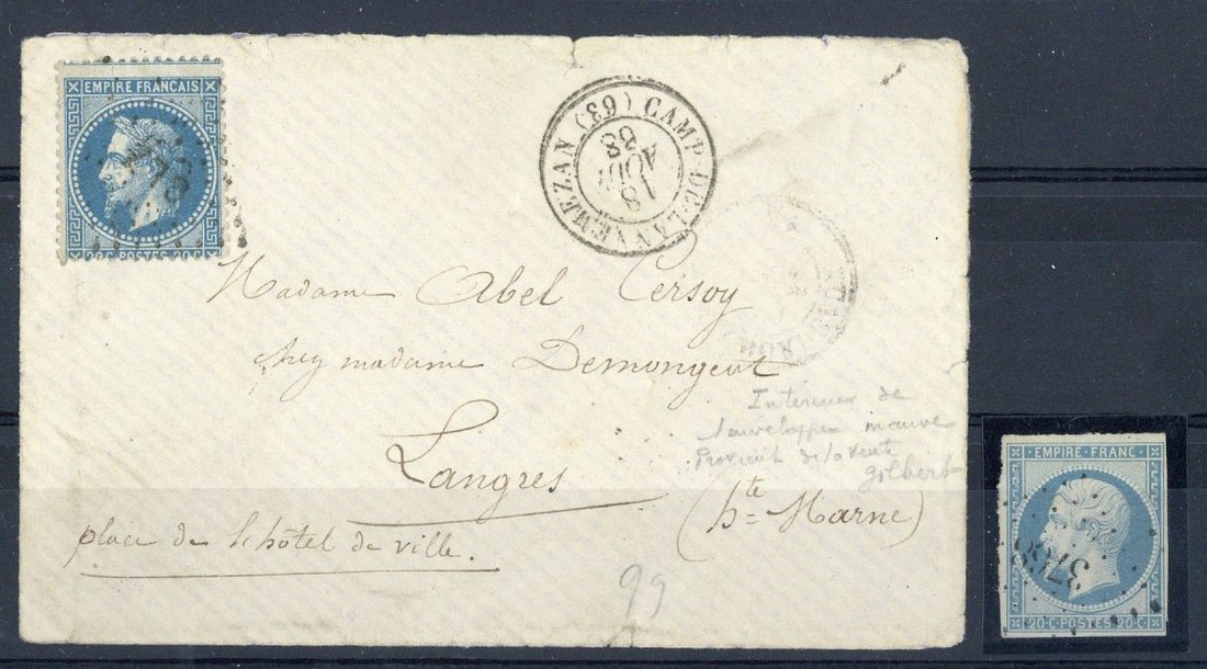 1868 (18 Aug.) envelope to Langres franked 1862 20c. with "clz" in lozenge cancellation and "camp de lannemezan" c.d.s. alongside; transit and arrival markings on reverse; fine. Also 1853-61 20c. milky blue with "3768 small figures cancellation of Jaffa. Each with A. Brun certificate (1961 or 1963)