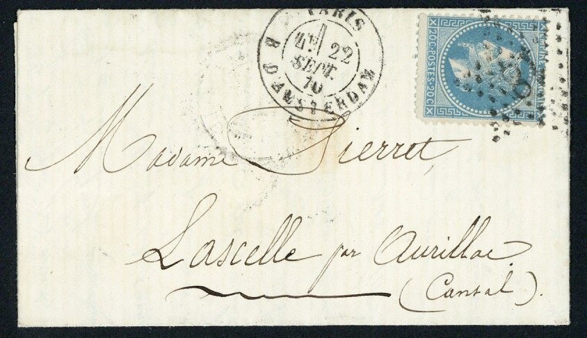 1870 (22 Sept.), small entire letter, without Ballon Monte inscription, addressed to Cantal, franked Empire 20c. with Paris star "18" cancellation and R. D'Amsterdam c.d.s. alongside, arrival datestamp of 21 Oct. on reverse; the adhesive with rounded corner and the entire with some paper adhering to the reverse; fine