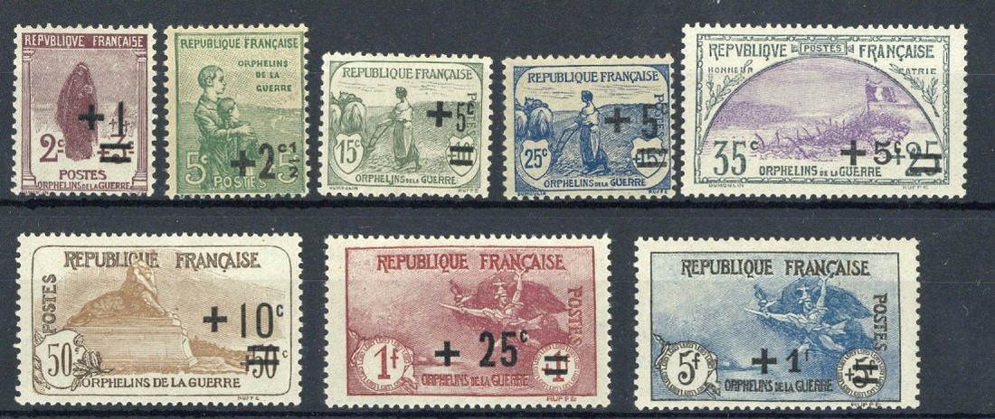 1922 Orphans set, unmounted mint and scarce thus, +25c. on 1f. + 1f. with gum crease, otherwise fine. S.G. 388-395. Yvert €530