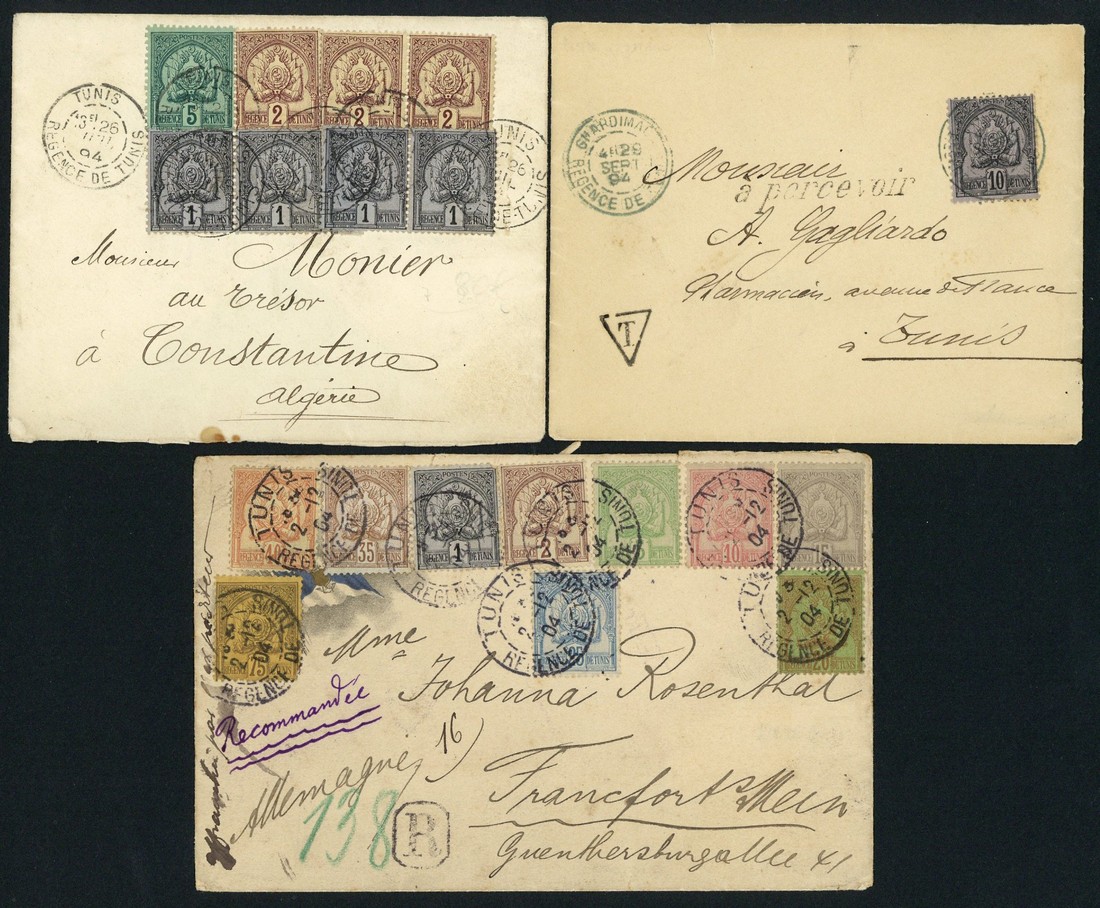 Selection of eighty covers and cards, including 1885 envelope to Marseilles bearing France Sage 15c. with ras-el-Oued cancellation, 1889 envelope to Orange bearing first issue 40c. and second issue 15c. (2), 1900 envelope to Sathonay bearing first issue 75c., 1901 cover bearing 15c. with La Mohammedia cancellation, 1938 (7 Feb.) Air Mail crash cover, postal stationery with 1905 5c. card with Medjez el Bab cancellation, another with blue Sidi Athman, 10c. letter card with octagonal Utique, etc., good to fine