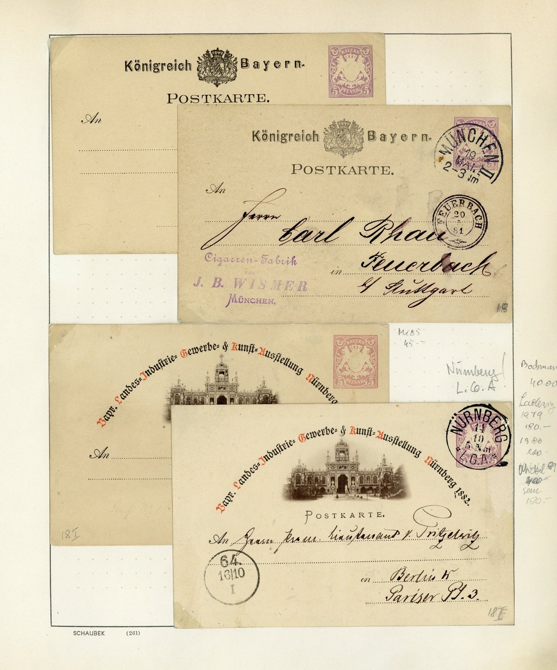 1801-1920 collection in two albums contained in a carton, including seventy-eight pre-stamp or early covers, over 400 stamps and 263 postal stationery items, with 1801 entire to Mannheim with de munic and signed by the King of Bavaria, 1808 with 100/spire, Postablage markings, experimental rhomboid on 1862-63 18k., 1867-69 18k. with straight line cancellation, etc., mixed condition but an ineresting lot
