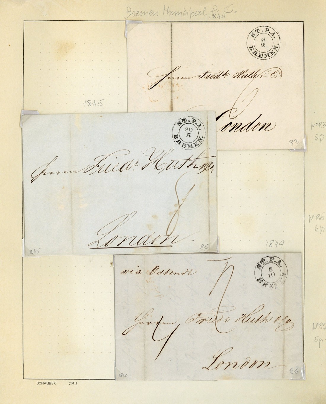 1792-1867 collection of thirty-four pre-stamp or stampless entires, mostly ex the Huth correspondence to London, including a good variety of markings with semi circular types, 'keys', 1805 red r4/bremen, 1807 red bremen/sep 17 180, 1867 bremerhaven, etc., also a few stamps in mixed condition with forgeries
