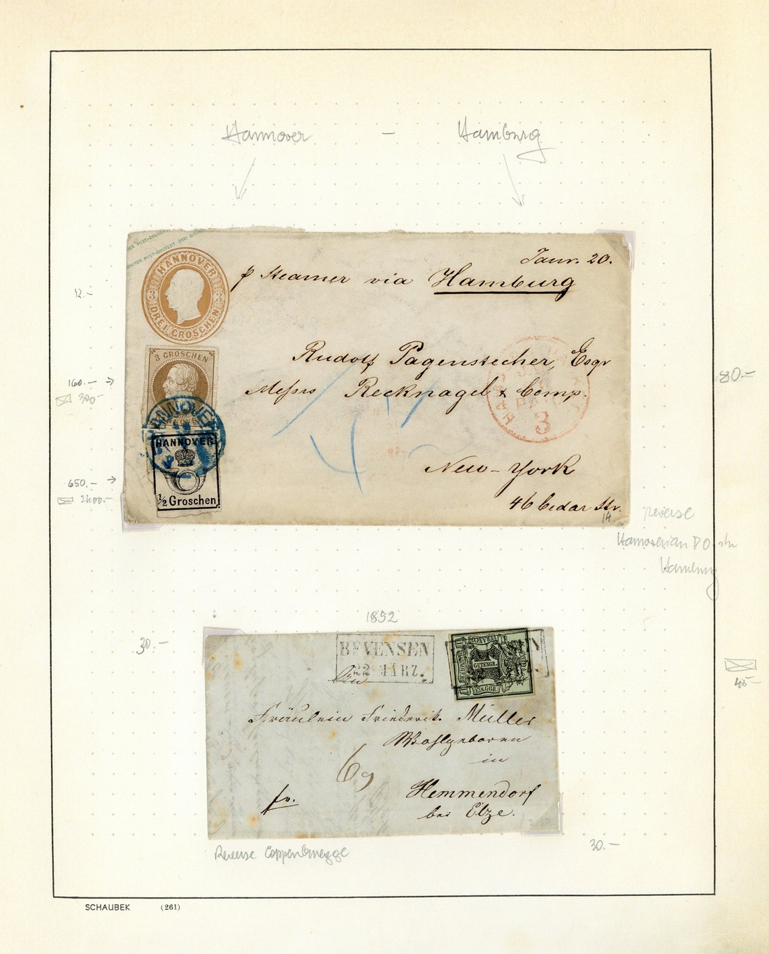 1778-1870 collection of 118 entires, entire letters or envelopes in blue album, including manuscript markings, 1810 (c.) with bremervorde, 1811 with haselunne, 1811 with goettingen dated, 1821 with red weener, 1863 3gr. postal stationery cover to New York additionally franked ½gr. and 3gr. (faults), etc., some stamps, mixed condition but a useful lot