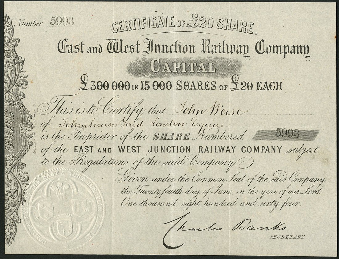 East and West Junction Railway Company, certificate for £20 share, 1864, no.5993, scrollwork at left, embossed seal, black, very fine and scarce.
