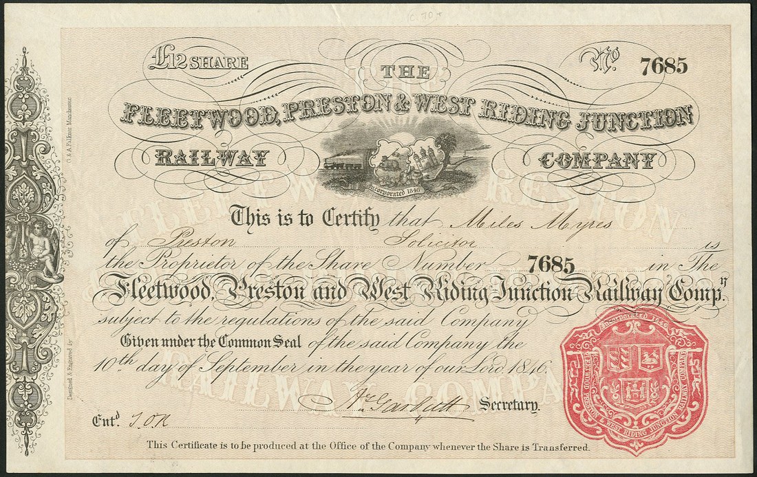 Fleetwood, Preston & West Riding Junction Railway Co., £12 share, 1846, no.7685, attractive vignette of coats of arms with steam train and plough in background, black with pink underprint, atractive red embossed seal, good very fine.