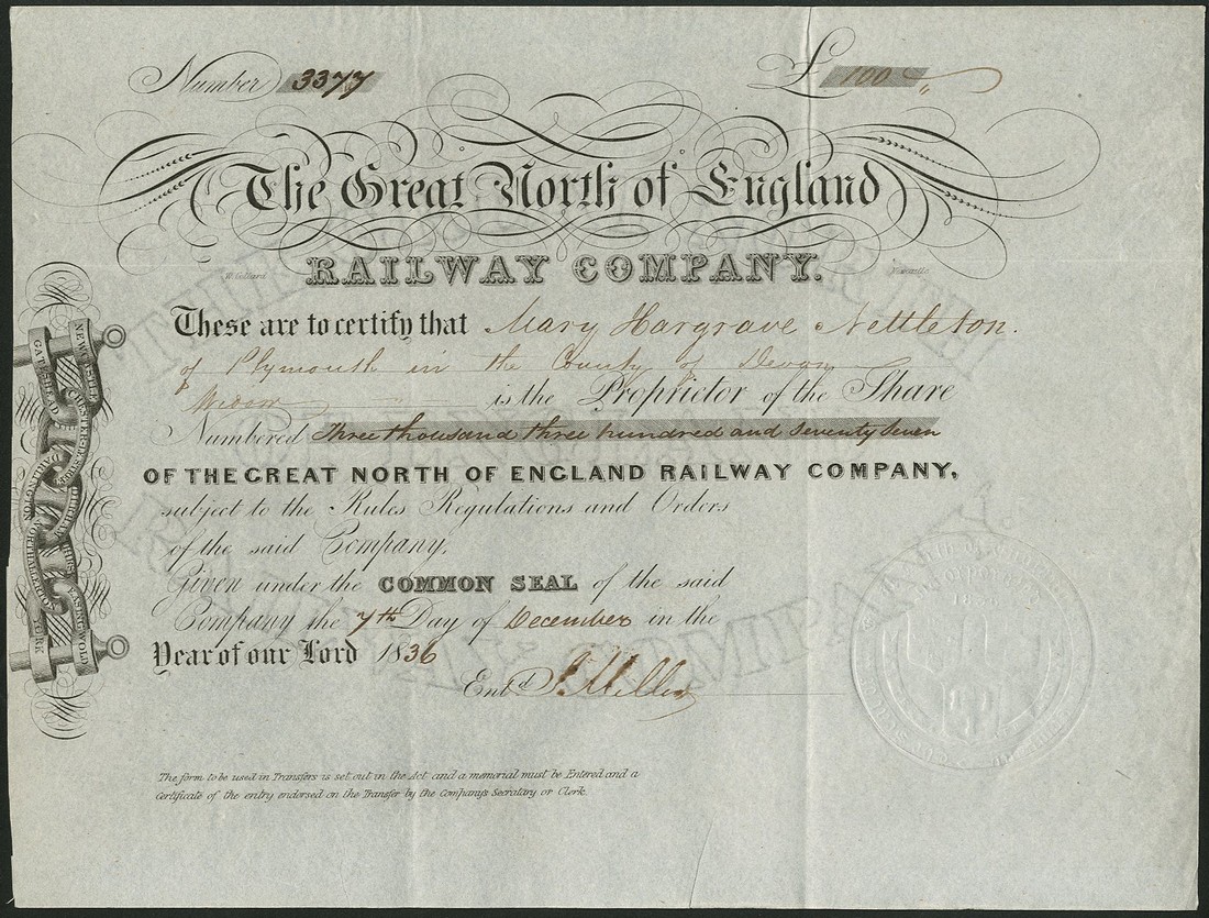 Great North of England Railway Co., £100 share, 18[36], no.3377, chain at left with names of towns through which the railway passed on each link, black, embossed seal, together with related transfer certificates (4), good very fine.