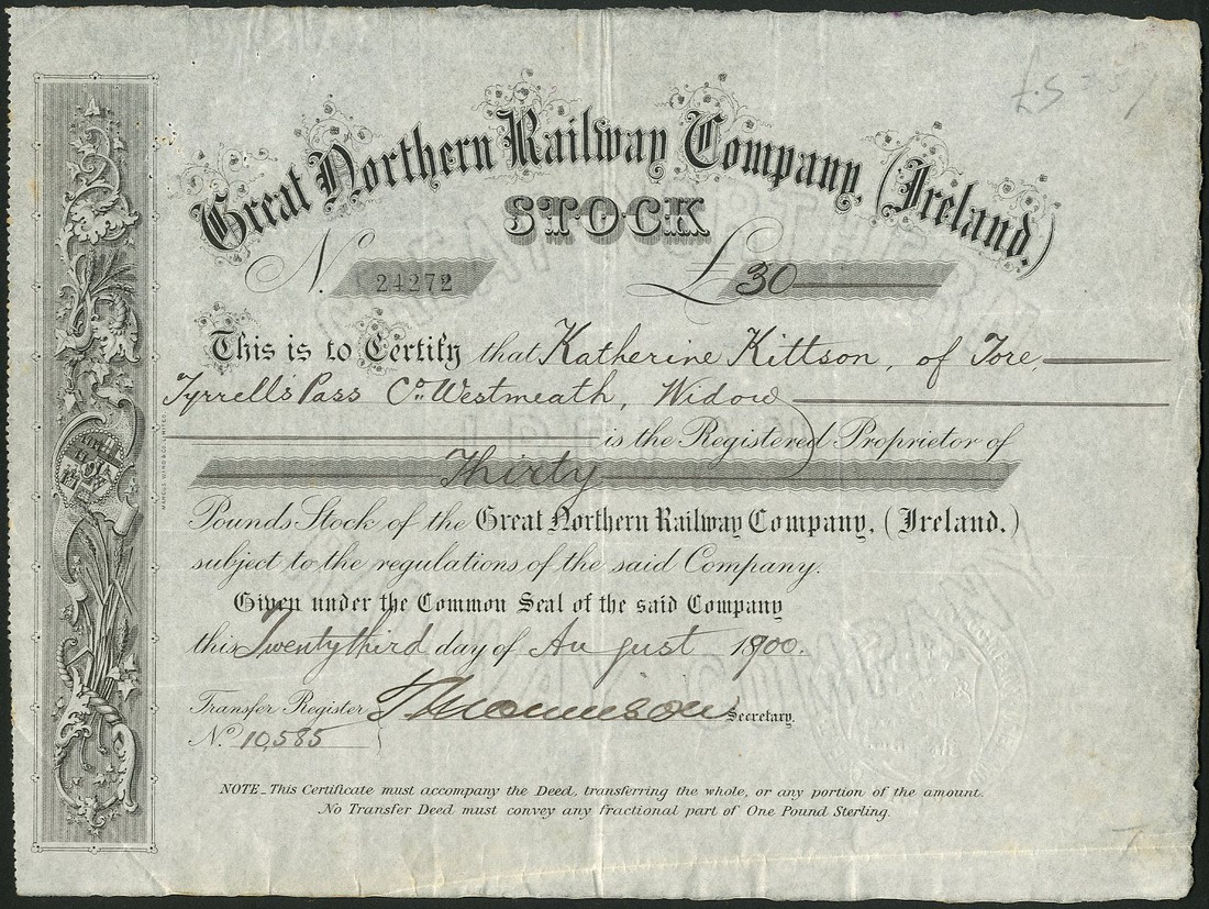 Great Northern Railway Company, (Ireland), a group of five certificates comprising; ordinary stock, 18[900], no.24272, scrollwork at left, black; consolidated 4% preference stock, 19[32], no.12374, ornate title and scrollwork to left, brown; consolidated 4% debenture stock, 19[32], no.12257 and 19[45], no.16126, this with edge tear, both red with yellow underprint; ordinary stock, 19[32], no.48237, ornate title and scrollwork, black, very fine and better. (5)