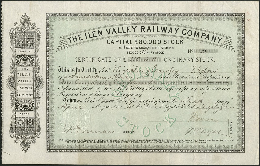 Ilen Valley Railway Company, certificate for ordinary stock, 18[84], no.29, ornate border, scrollwork at left, black with green underprint, printed by Waterlow & Sons, very fine.