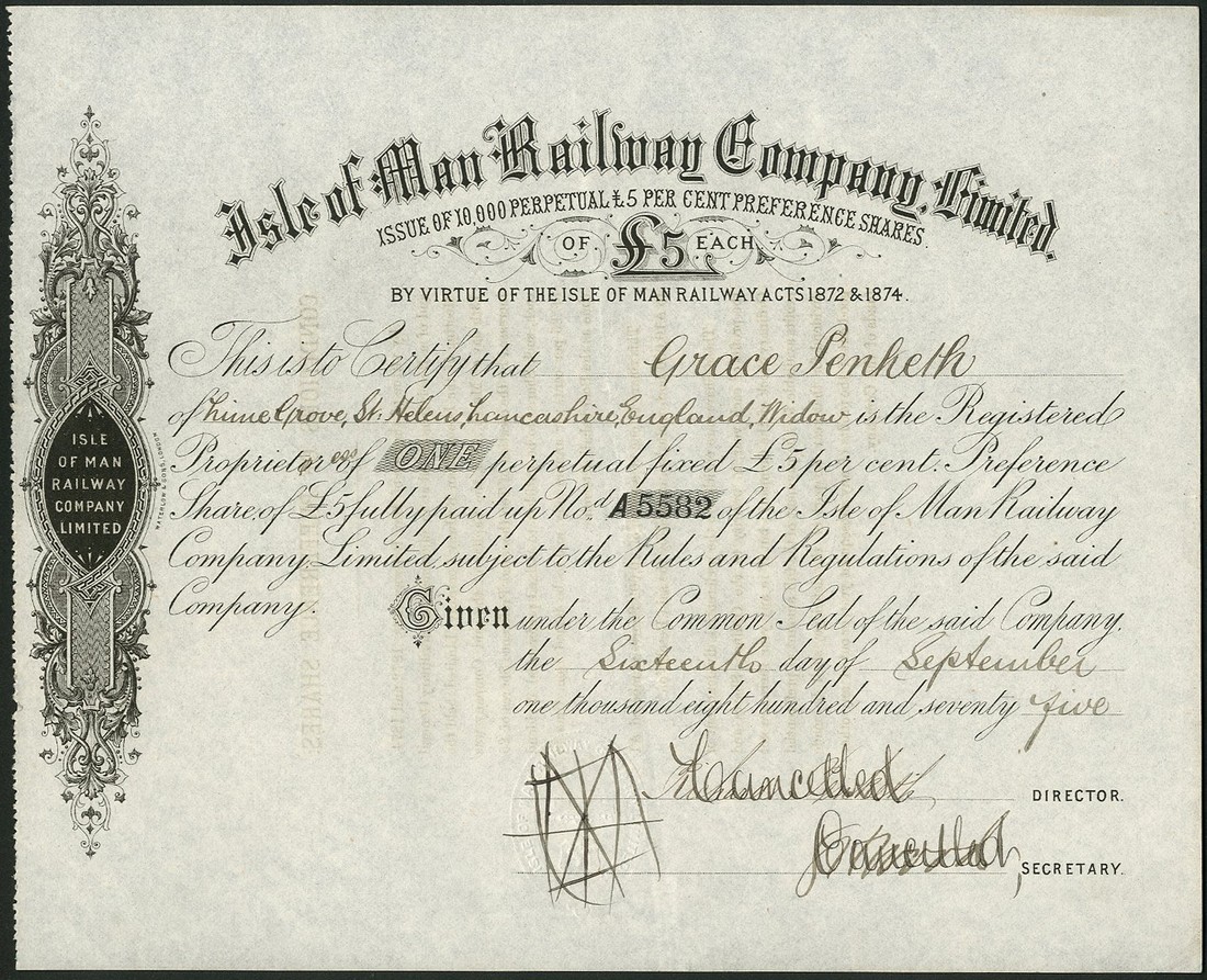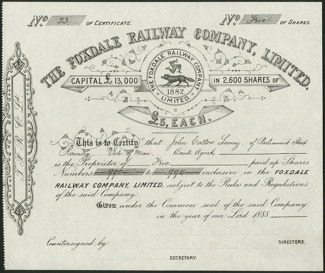 Isle of Man Railway Company Ltd., certificate for perpetual 5% preference share of £5, 187[5], no.A5582, scrollwork to left, black, ink cancelled, together with Foxdale Railway Company Ltd., certificate for £5 shares, 18[88], no.23, not signed or countersigned, decorative title with fox and trisceles logo at centre, black, good very fine and extremely fine. (2)