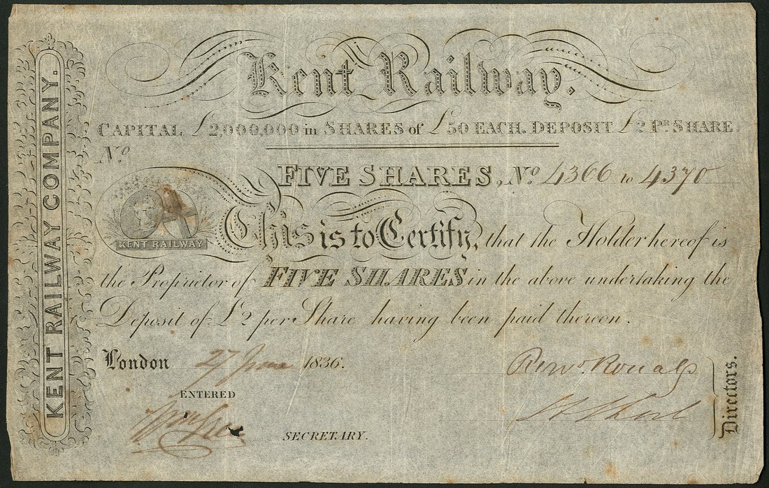 Kent Railway, certificate for five shares of £50 each, 1836, no's 4366-4370, shields to left, black, a little toned, about very fine.