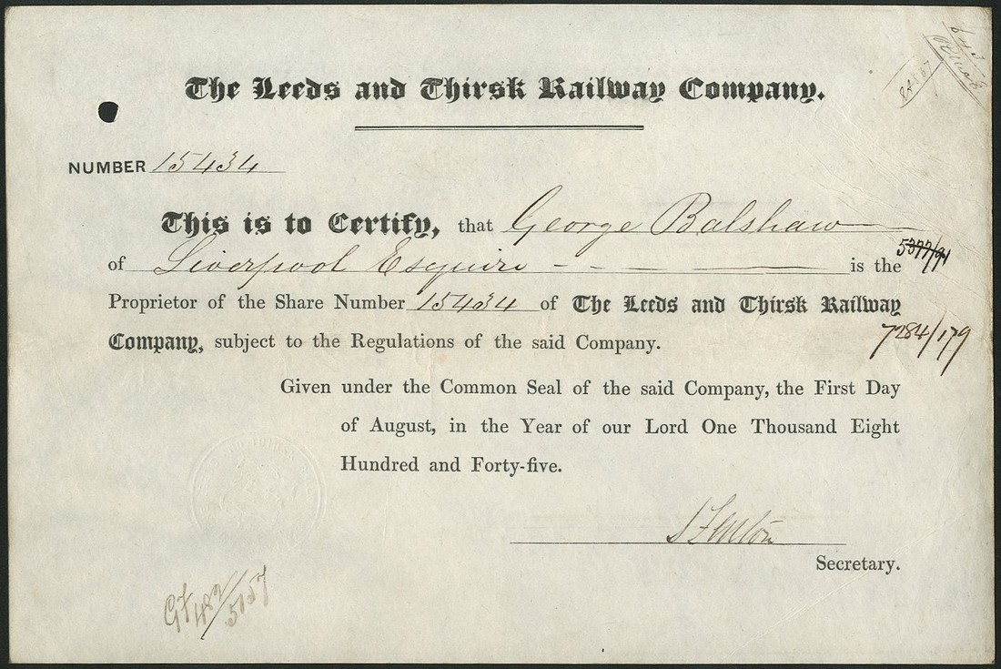 Leeds and Thirsk Railway Company, certificate for one share, 1845, no.15434, black on vellum, good very fine.