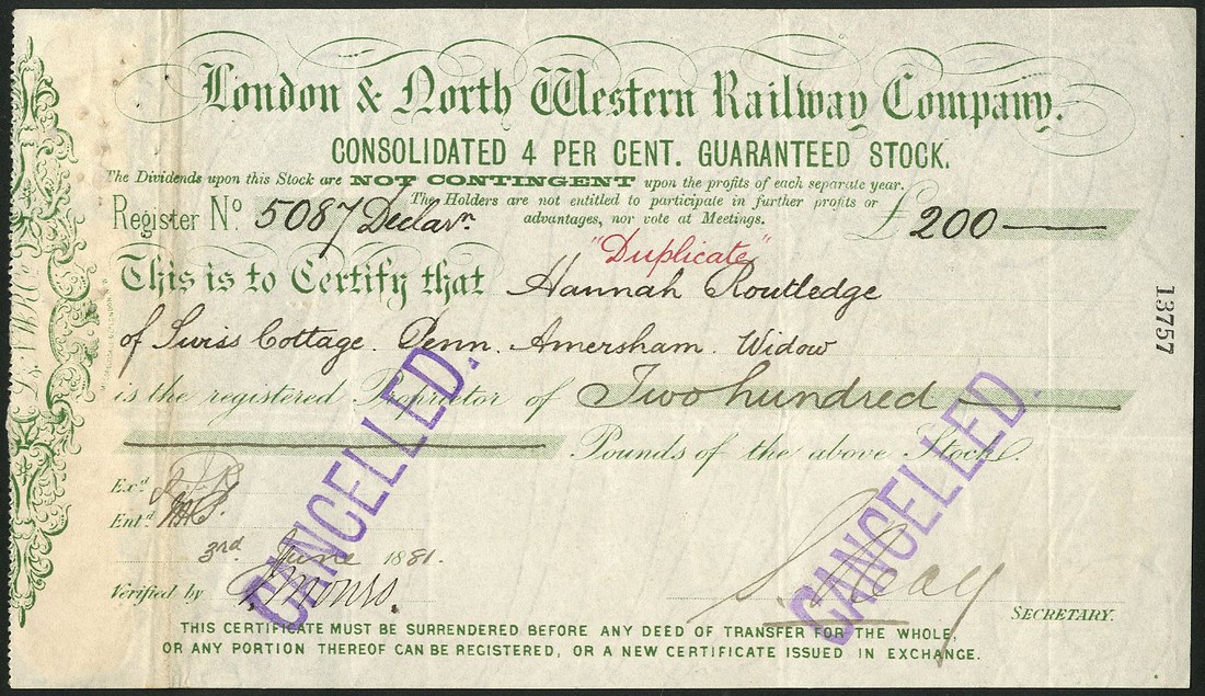 London and North Western Railway Company, a collection of 14 certificates including; consolidated 4% guaranteed stock, 18[81], no.5087, green; 3% perpetual debenture stock, 190[2], no.24120, red; consolidated stock, 19[10], no.99079, black; consolidated 4% preference stock, 19[15], no.11678, red; various consolidated stock certificates, 1840's and 50's, and other documents, most are cancelled, mixed condition, some with glue residue, many very fine. (14)