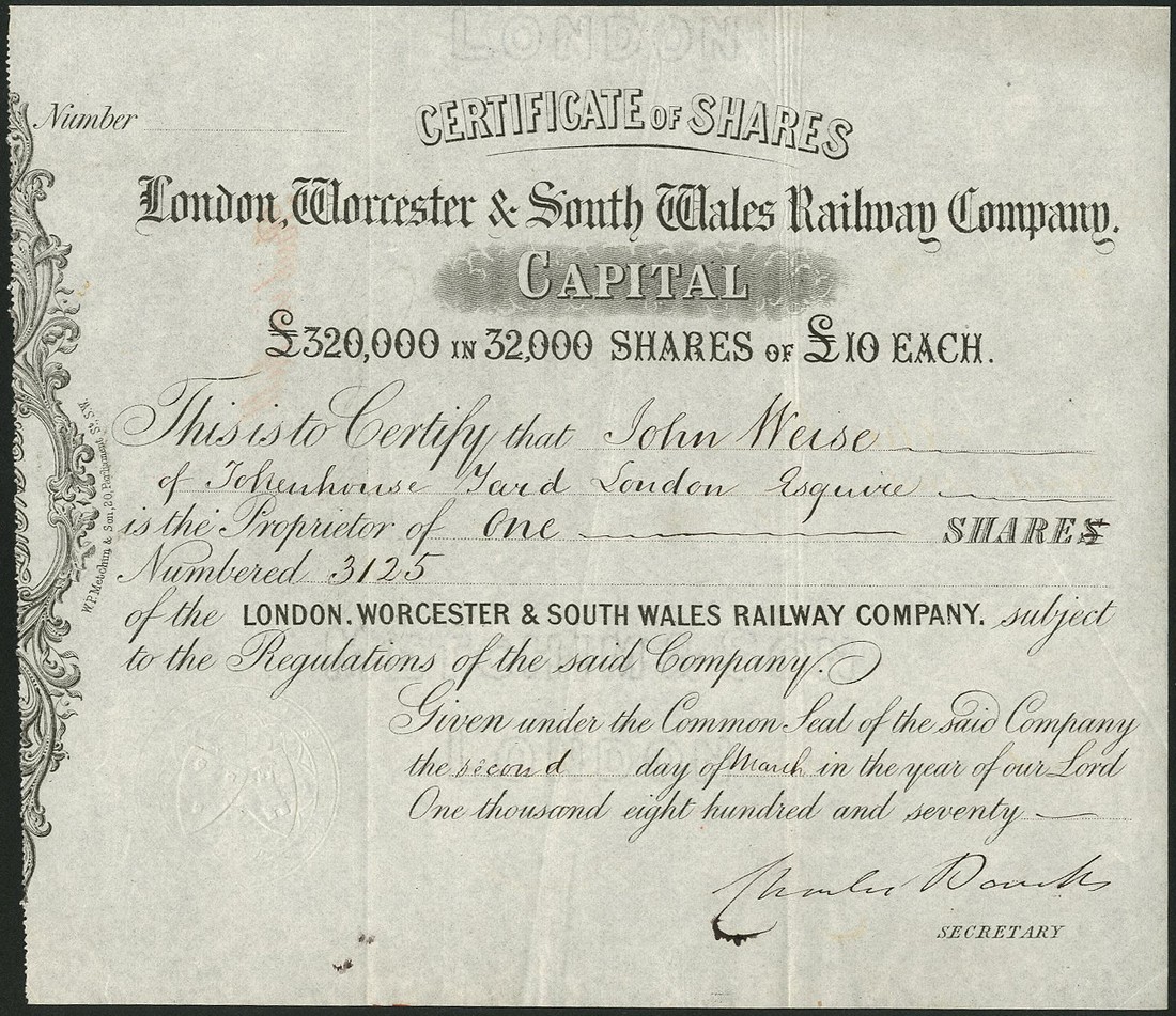 London, Worcester and South Wales Railway Company, £10 shares, 1870, no.3125, scrollwork to left, black very fine.