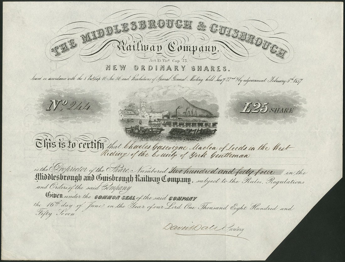 Middlesbrough & Guisbrough Railway Company, certificate for New ordinary share of £25, 1857, no.244, attractive piece with vignette of steam train with factory and town in background, black, lower right corner cut away as cancellation, good very fine.