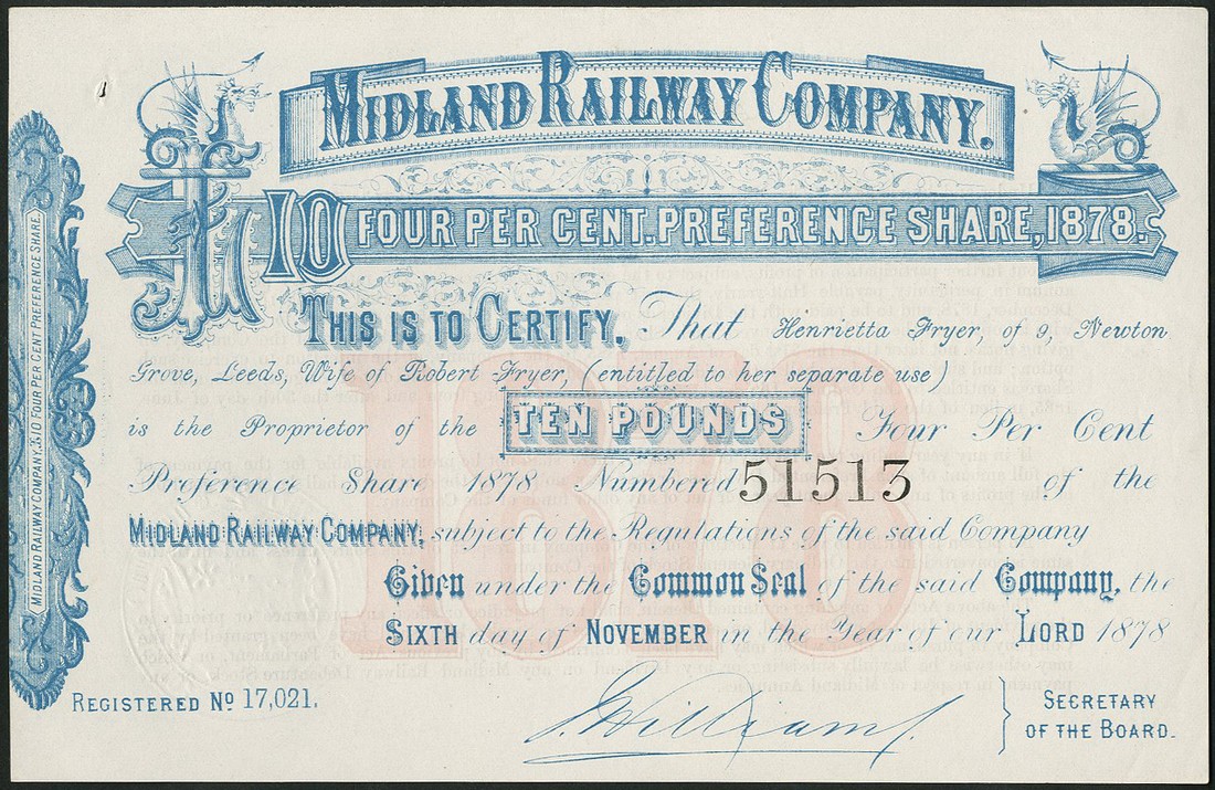 Midland Railway Company, a collection of 4 certificates comprising; £10 4% preference share, 1878, no.51513, blue; 2.5% debenture stock, 191[6], no.68879, olive green; consolidated 2.5% perpetual guaranteed preferential stock, 19[15], no.31515, green, cancelled; consolidated 2.5% perpetual preference stock, [1912], no.93387, brown, cancelled, together with other documents (5) including application for £50,000 perpetual 5% debenture stock for the Somerset and Dorset Railway Companies extension to the Midland Railway, 1874 and dividend warrants with cheques still attached, very fine and better. (9)