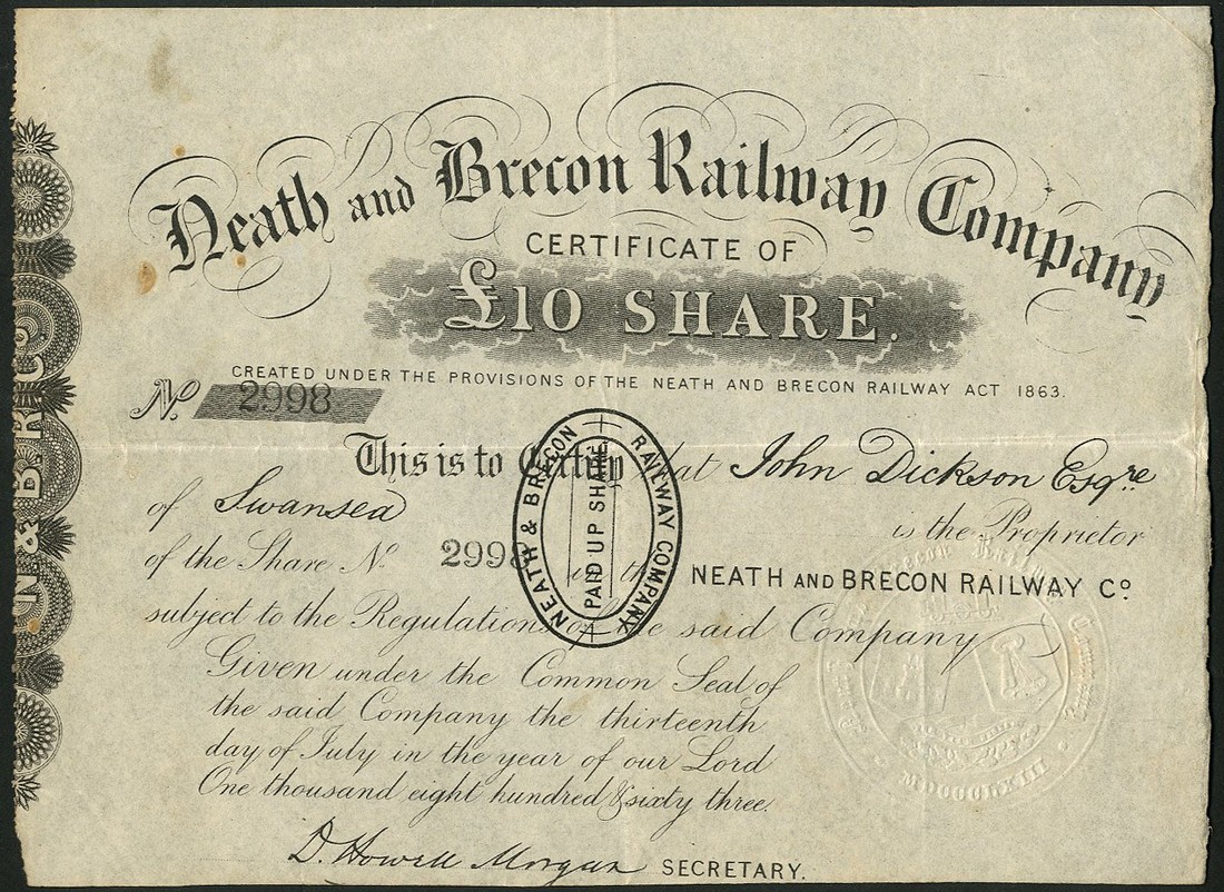 Neath and Brecon Railway Company, certificate of £10 share, 1863, no.2998, embossed seal bottom right, black, very fine.
