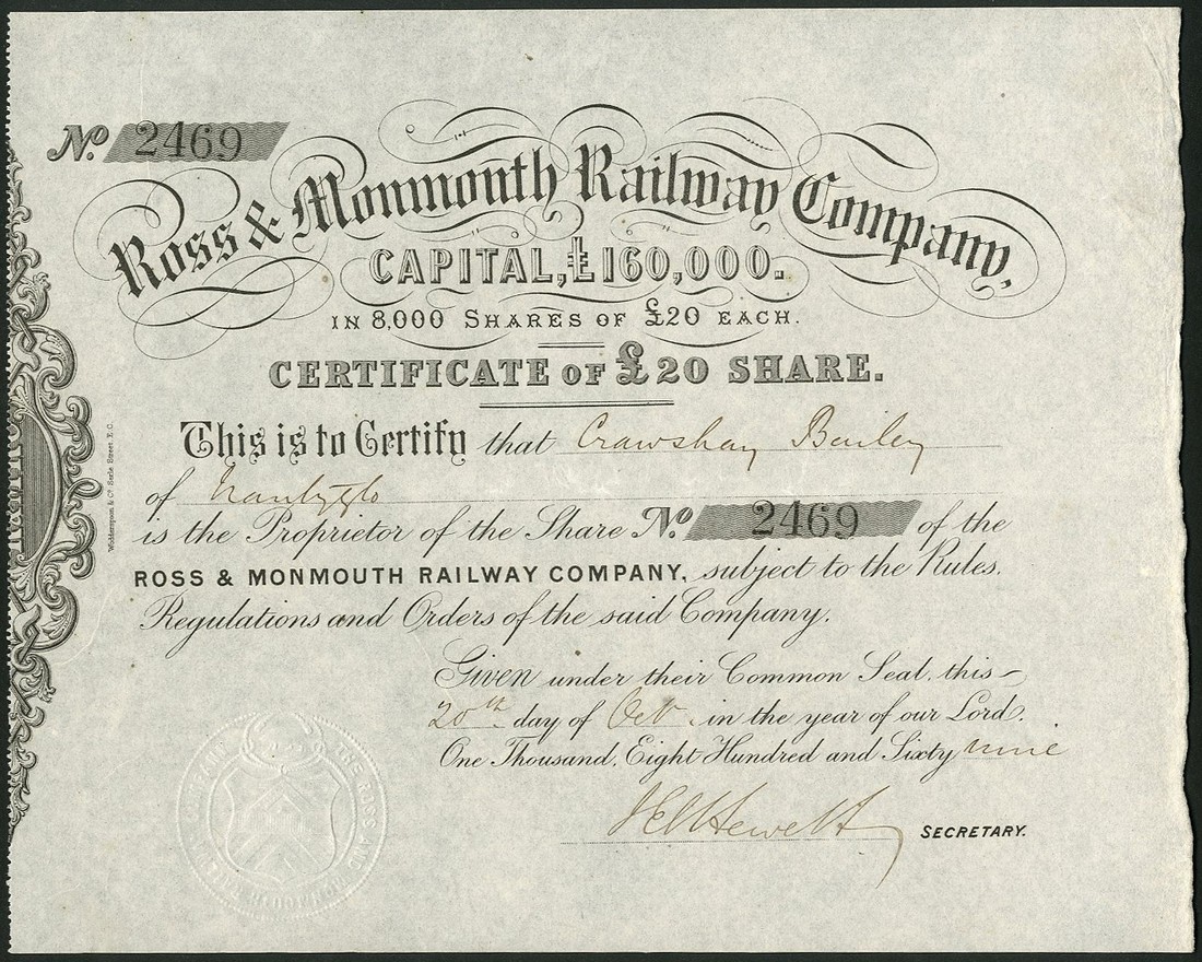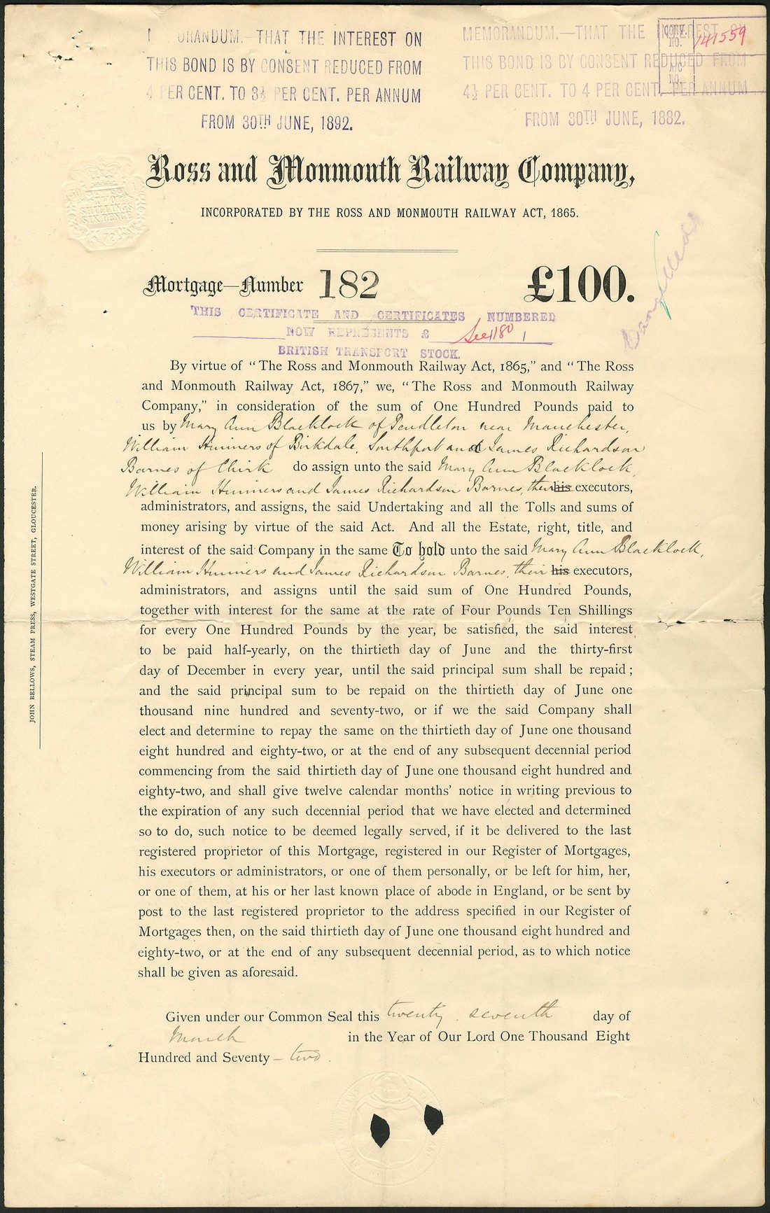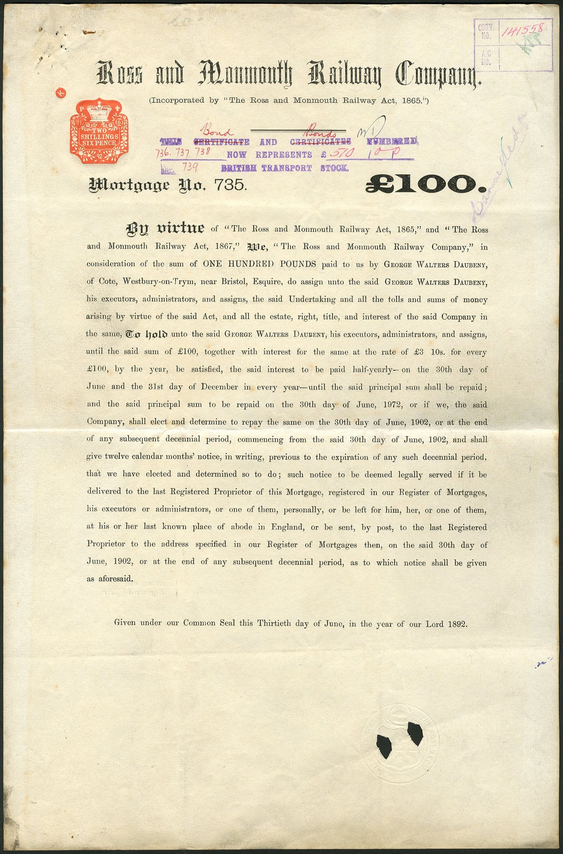 Ross & Monmouth Railway Company, £20 share, 186[9], no.2469, black, together with a pair of mortgage bonds for £100, 187[2], no.182 and £100, 1892, no.735, the last two hole cancelled, very fine, the first good very fine. (3)