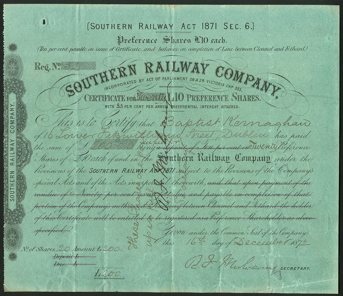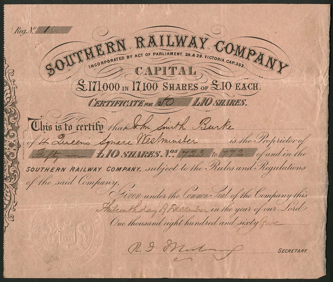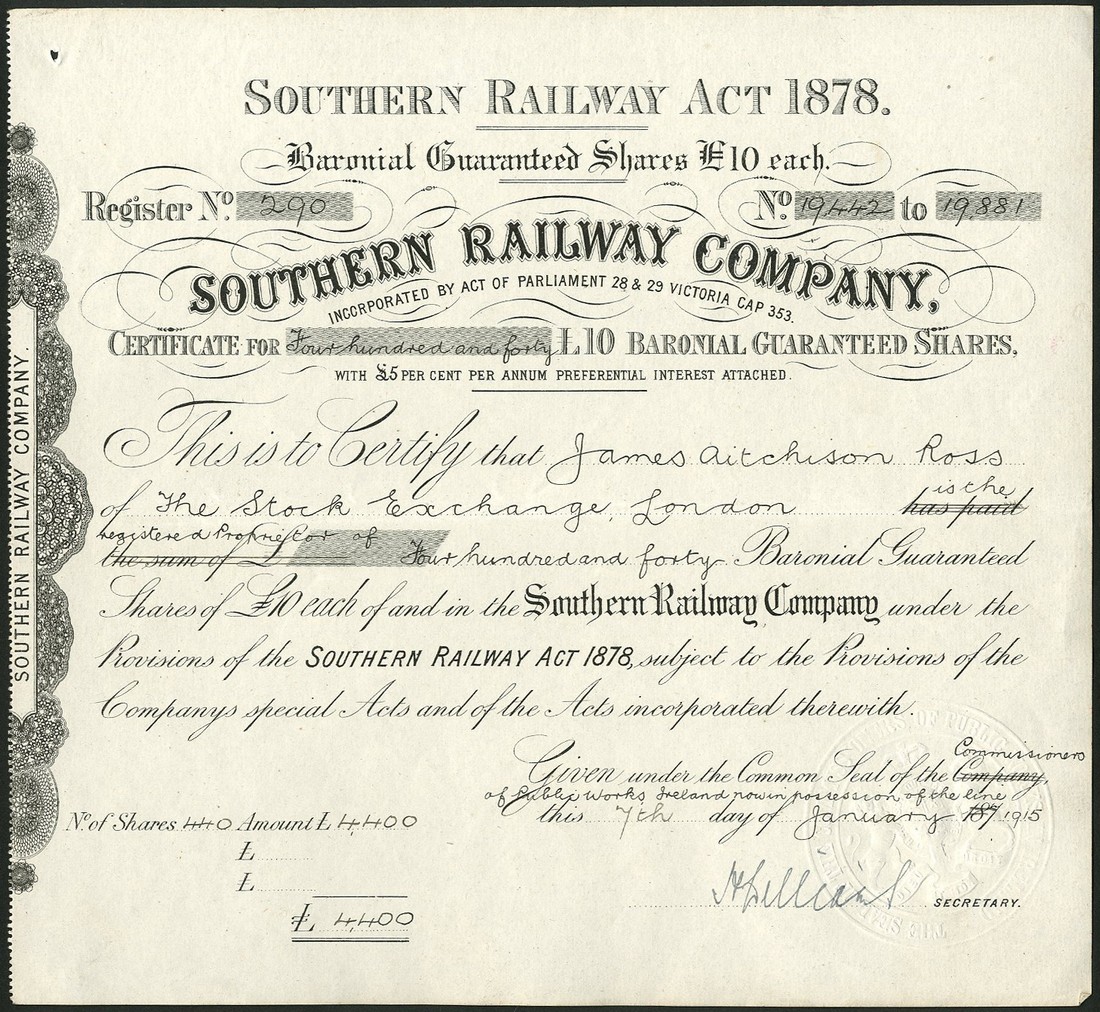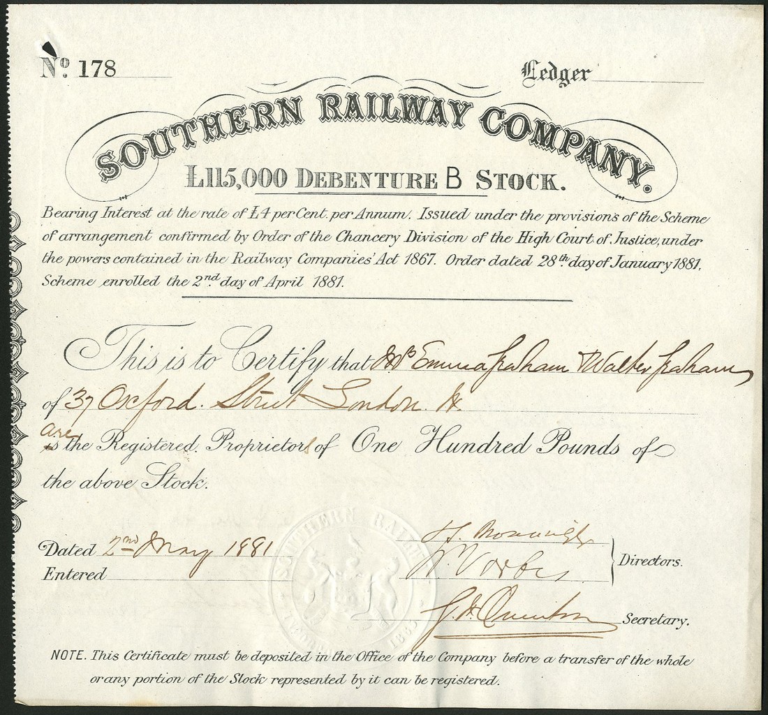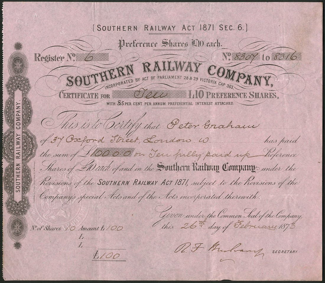 Southern Railway Company, a group of five certificates comprising; £10 preference shares, 187[2], no.52, black on green paper; £10 shares, 186[5], no.1, black on orange paper; £10 preference shares, 187[3], no.6, black on pink paper; debenture B stock, [1881], no.178, embossed seal, black and £10 Baronial Guaranteed shares, 187[915], no.290, black, about very fine to extremely fine. (5)