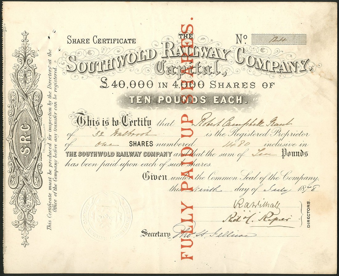 Southwold Railway Company, certificate for £10 shares, 18[78], no.724, scrollwork at left, embossed seal, black, some surface dirt, good very fine.