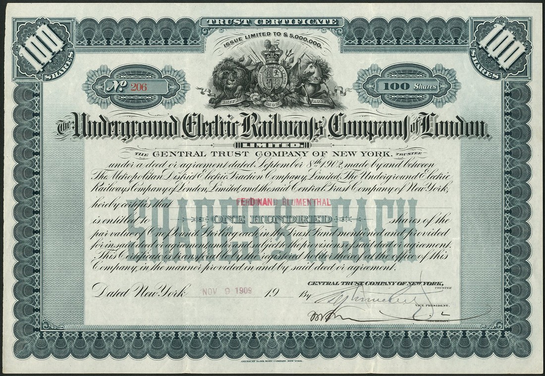 Underground Electric Railways Company of London Ltd., Trust certificate for 100 shares of £1 each, 19[09], no.206, British coat of arms at top, ornate border, blue, printed by American Bank Note Co., about extremely fine.