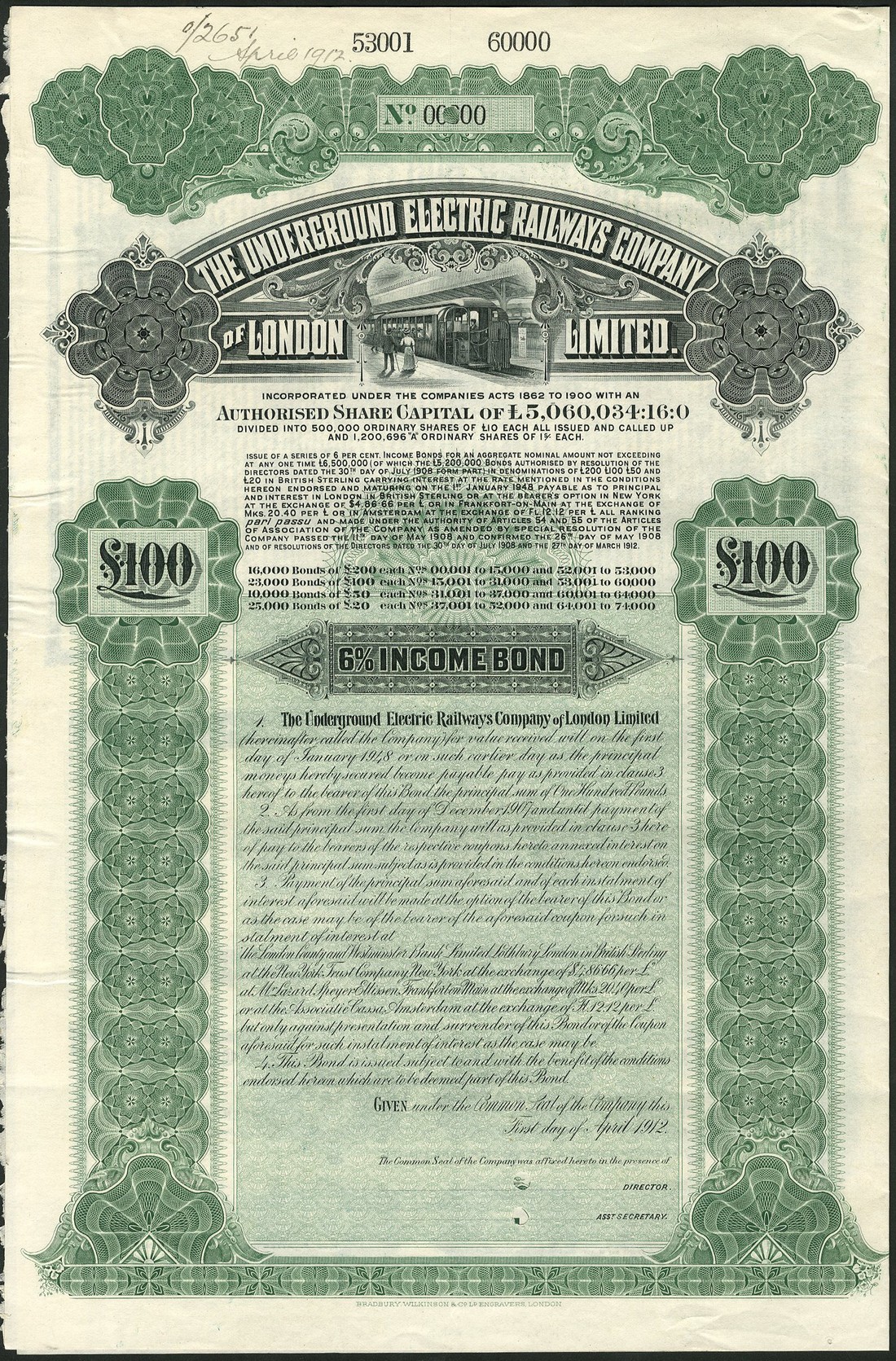 Underground Electric Railways Company of London Ltd., a specimen 6% income bond for £100, 1912, from the Bradbury, Wilkinson & Co. archive, attactive vignette of underground train at station, ornate border, green and black, with coupons, light paper adhesion on reverse, about extremely fine.