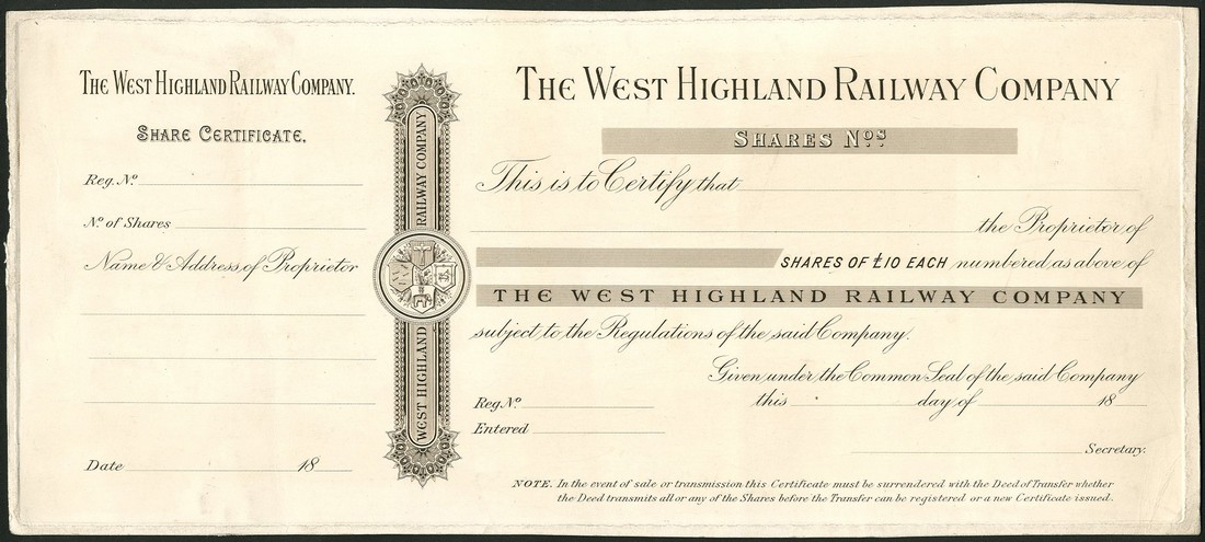West Highland Railway Company, a proof certificate for £10 shares, 18[--], circa 1880, black printing, on thick card, extremely fine.
