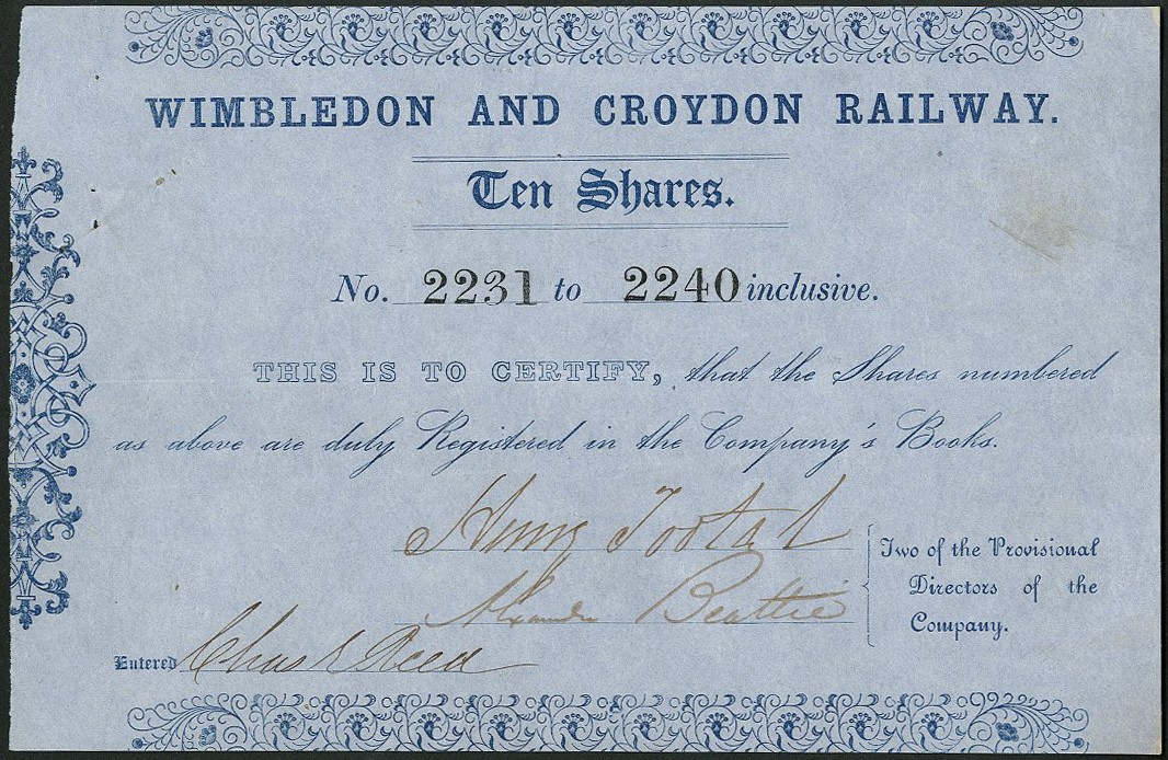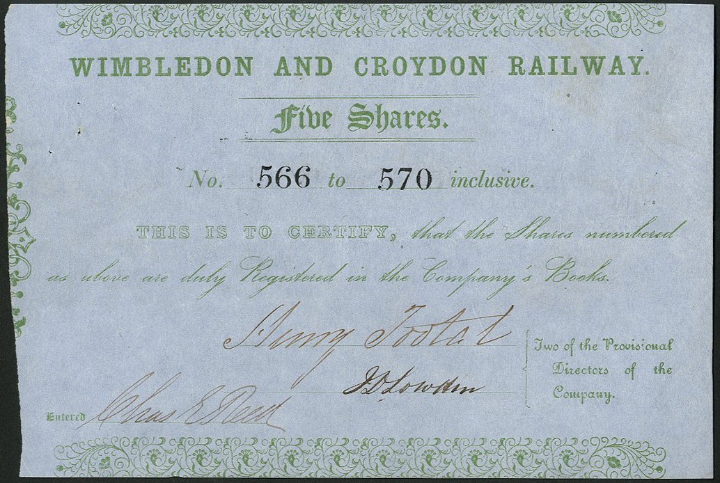 Wimbledon and Croydon Railway, a pair of scrip certificates for 5 and 10 shares, undated but circa 1844, both with ornate scrollwork, green on blue paper and blue on blue paper respectively, both about extremely fine. (2)
