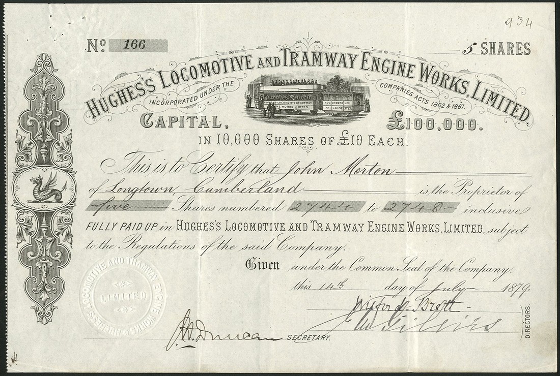 Hughes's Locomotive and Tramway Engine Works Ltd, £10 shares, 187[9], no.166, attractive vignette of tram carriages under title, scrollwork to left, very fine and rare.