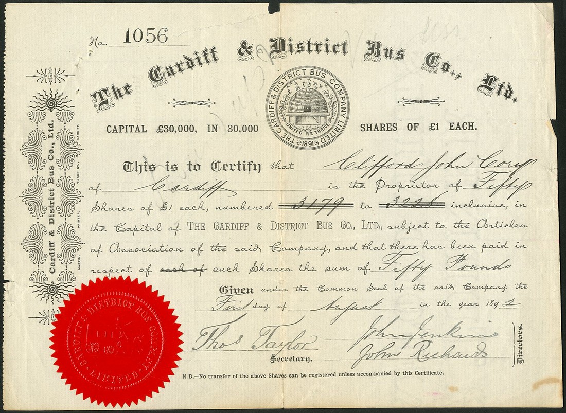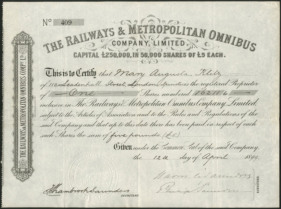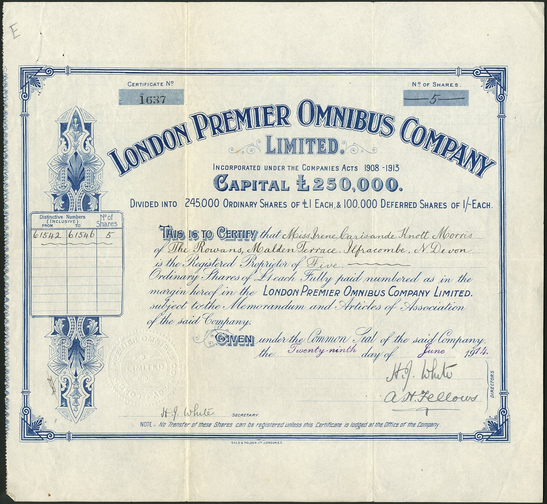 Railways & Metropolitan Omnibus Company Ltd., certificate for £5 shares, 18[99], no.409, scrollwork to left, black, prited by Waterlow & Son, together with London Premier Omnibus Company Ltd., £1 ordinary shares, 19[14], no.1637, ornate border and scrollwork, blue, printed by Gale & Polden Ltd, and Cardiff & District Bus Co. Ltd., £1 shares, 189[2], no.1056, company seal below title, red paper seal at bottom left, black, the first and second very fine, the latter with tear at top and a couple of edge nicks, about very fine. (3)