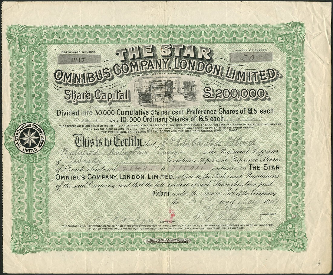 Star Omnibus Company, London, Ltd., certificate for 5½% cumulative preference shares of £5 each, 19[07], no.1217, ornate border, vignette under title depicting Omnibus', green and black, printed by Waterlow Bros & Layton,, light creasing, otherwise about very fine.