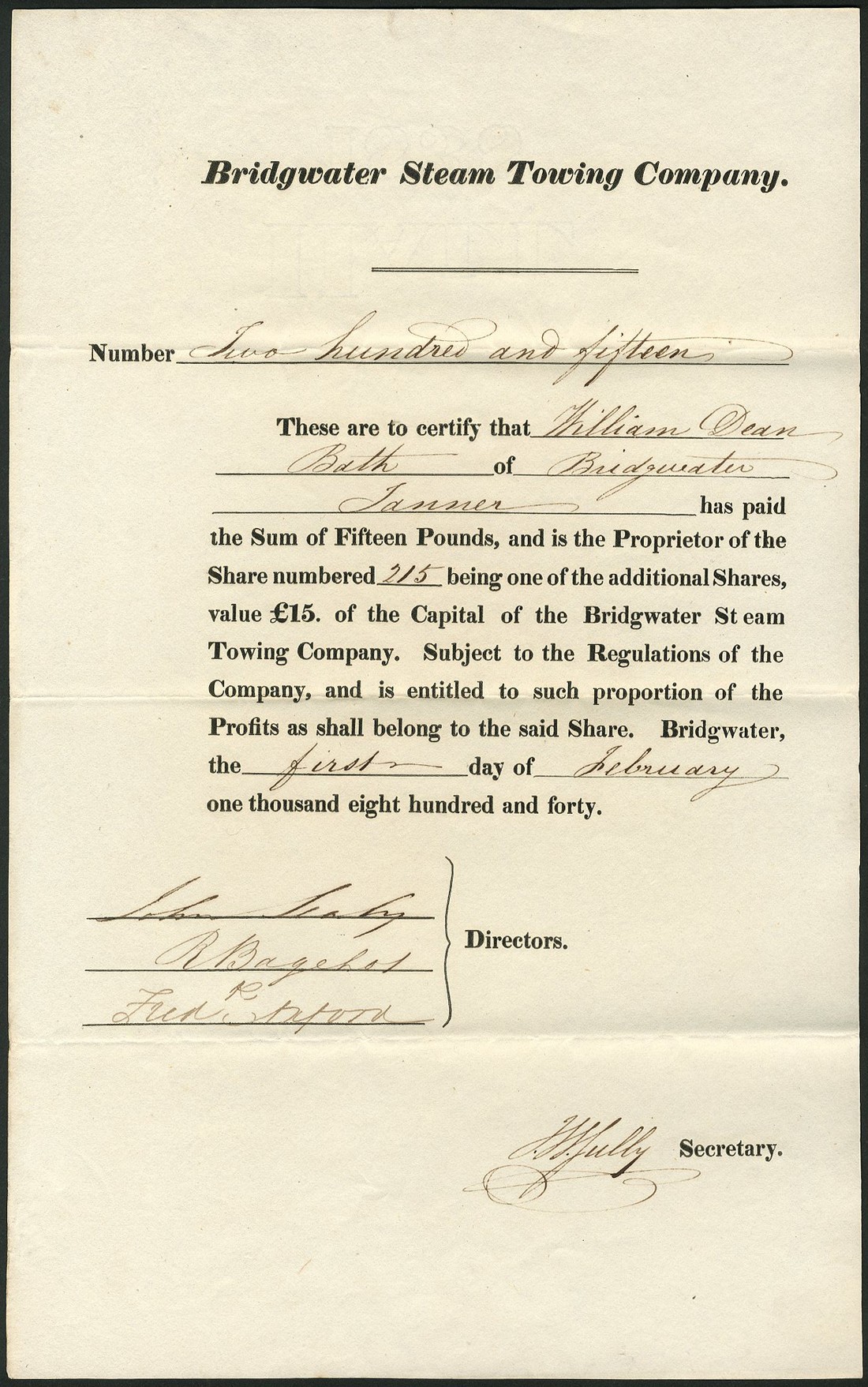 Bridgwater Steam Towing Company, £15 'additional' share, 1840, no.215, plain black printing on thick paper, good very fine and rare.