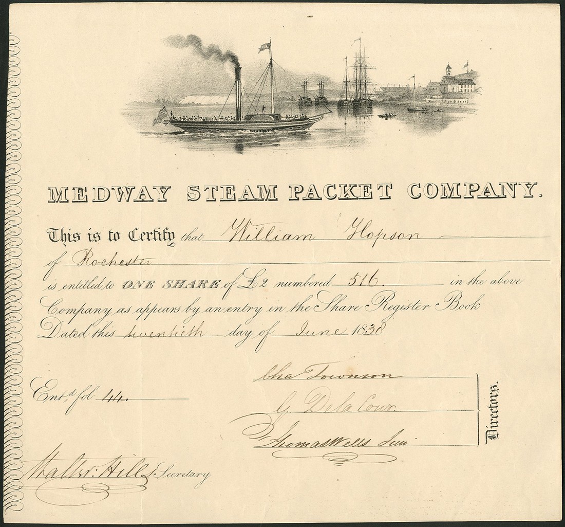 Medway Steam Packet Co., certificate for one share of £2, 18[38], no.516, attractive vignette of paddle steamer arriving at port, black, very fine.