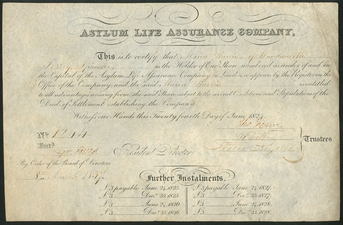 Asylum Life Assurance Company, certificate for one share, 1824, no.1244, finally fully paid in 1837, black printing, on vellum, crease at top right corner otherwise about extremely fine with usual discolouration.