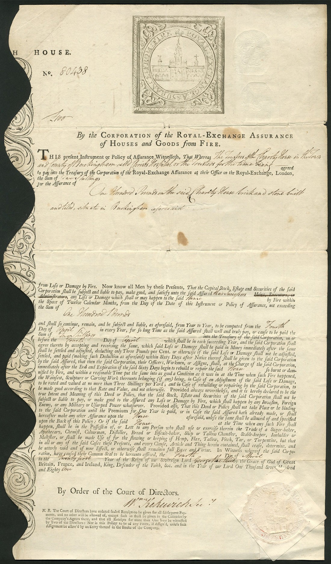 Royal Exchange Assurance, an early fire policy, 178[1], covering property in Buckinghamshire, large format, vignette of company seal in square frame, scrollwork at left, black, paper seal at bottom right, some burn marks,split at folds but fine to very fine and scarce.
