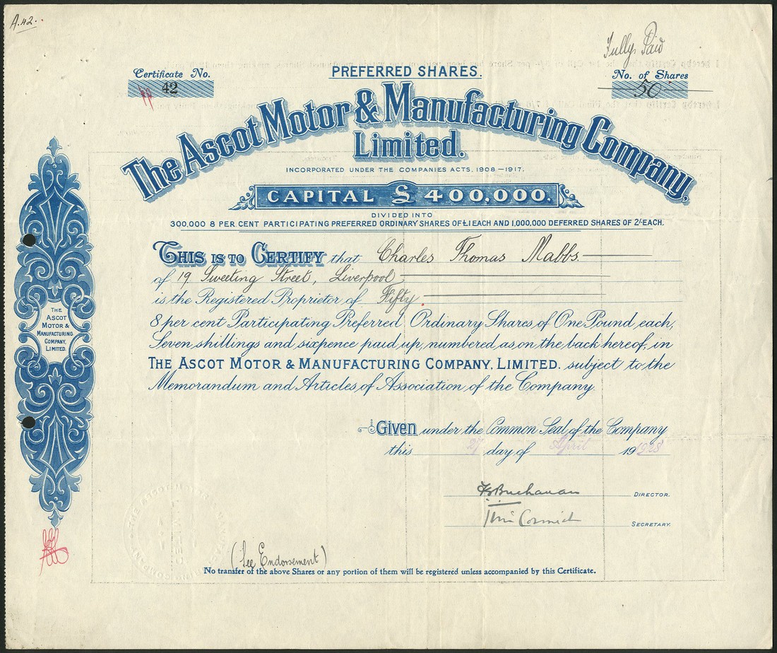 Ascot Motor & Manufacturing Company, Ltd., a pair of certificates comprising 2 shilling deferred shares, 19[28], no.143, scrollwork at left, embossed seal bottom left, red, and 8% participating preferred ordinary shares of £1 each, 19[28], no.42, design as before, blue, filing holes at left, both very fine. (2)